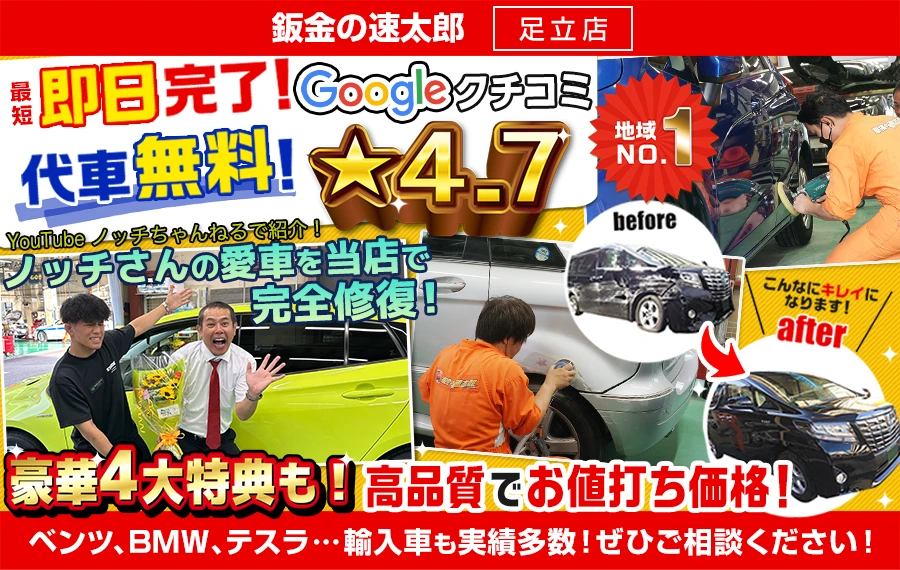 東武伊勢崎線、五反野駅から歩いて3分!!創業70年の地域密着工場として、お客様に安心、丁寧、確実な仕事を心掛けて実績と信頼を築いて参りました。お車のちょっとしたヘコミ・キズだけでなく、重鈑金作業や保険鈑金にも対応致します。もちろんリサイクル部品で環境にもやさしい経済的な修理も行えます。他にも、車検整備、車販売買取、自動車保険などお車のことならお気軽にご相談ください。お待ちしております。